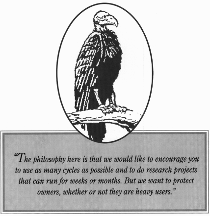 To lure them to Condor, the design team was careful to make the new system attractive to both heavy and light users, so the cycle monsters could feel free to do time-consuming research. "The philosophy here is that we would like to encourage you to use as many cycles as possible and to do research projects that can run for weeks or months," Livny explains. "But we want to protect owners, whether or not they are heavy users."